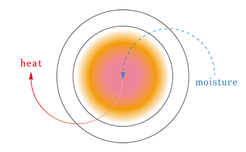 身体から発せられた水分をカポック繊維の中空部分が吸収し、水蒸気が水に変わる時に発生する凝縮熱を利用して発熱します。